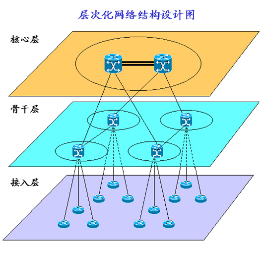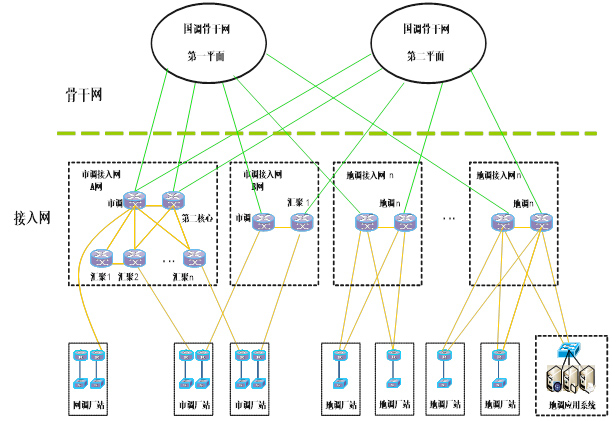 針對區域級電力調度數據網的網絡規劃,京海公司提出三層網絡結構設計,即核心層、匯聚層、接入層。核心層為網絡業務的交匯中心,通常情況下核心層只完成數據交換功能;匯聚層位于核心層和接入層之間,主要完成業務的匯聚和分發;接入層主要將用戶業務接入網絡,實現質量保證和訪問控制。層次化網絡結結構設計如下所示: