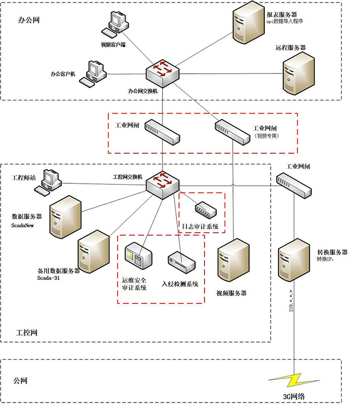 在工控網與辦公網之間增加工業網閘,僅允許特定的辦公網主機(報表服務器和遠程服務器)訪問特定的工控網主機(SCADA數據服務器),且僅允許OPC協議通過,除此之外的任何主機、任何通信協議,均不允許通過。